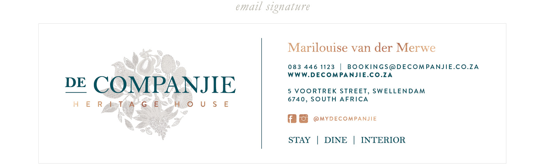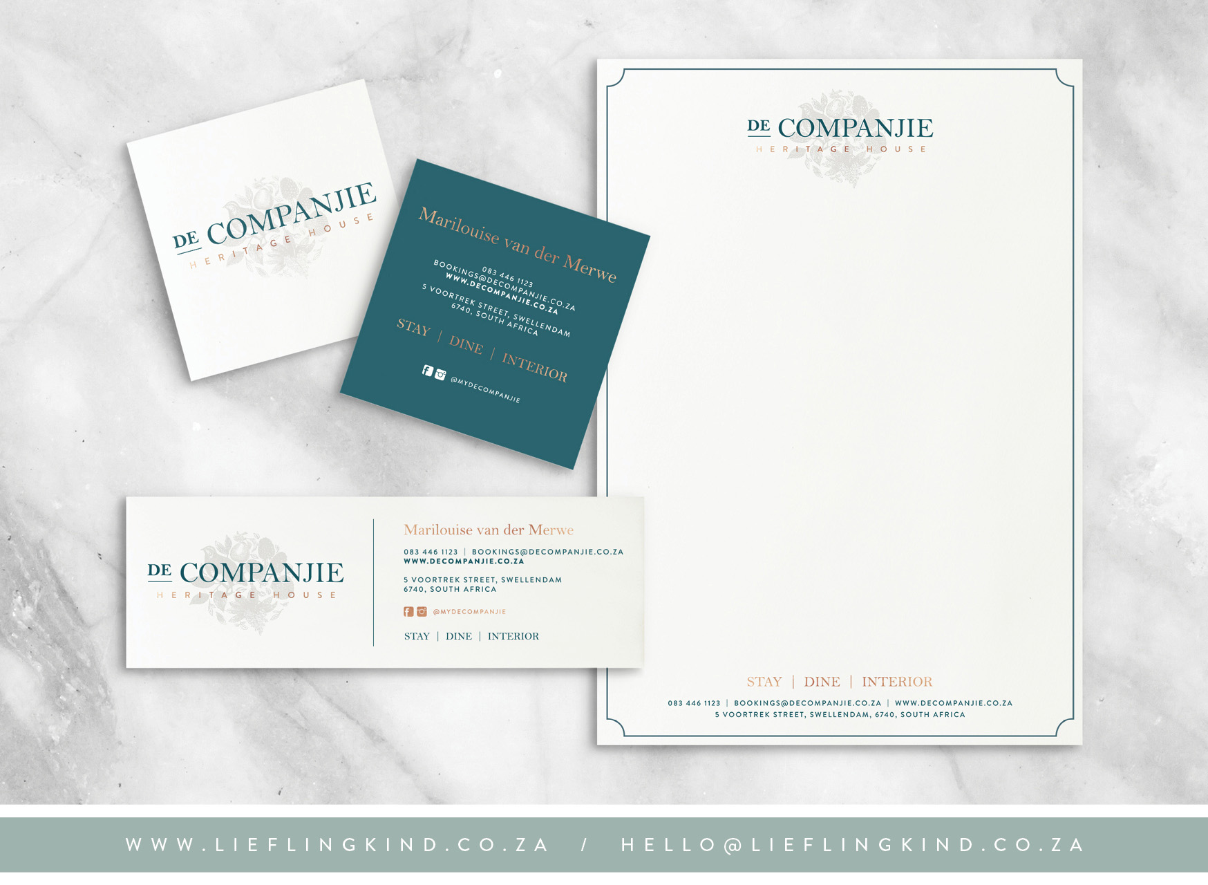 Situated in picturesque Swellendam, DeCompanjie is more than just a guesthouse – it has its own restaurant & is a well-known meeting place where everyone is welcome. Food is sourced locally & responsibly, and every detail is considered to make guests feel at home. We incorporated all these things – food, foliage & nature – into their gorgeous watermark and I love how the logo envelopes so many of their values.