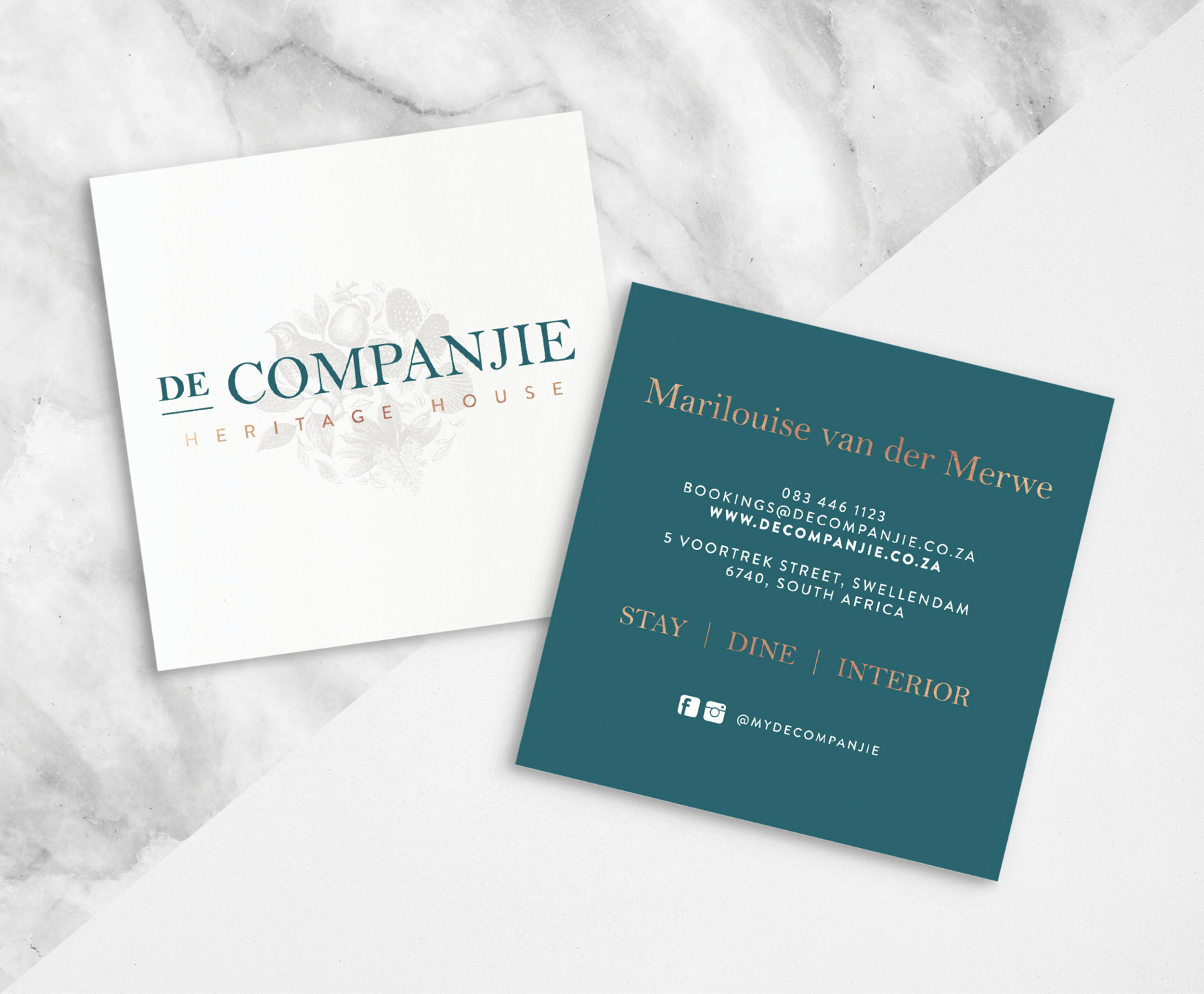 Situated in picturesque Swellendam, DeCompanjie is more than just a guesthouse – it has its own restaurant & is a well-known meeting place where everyone is welcome. Food is sourced locally & responsibly, and every detail is considered to make guests feel at home. We incorporated all these things – food, foliage & nature – into their gorgeous watermark and I love how the logo envelopes so many of their values.