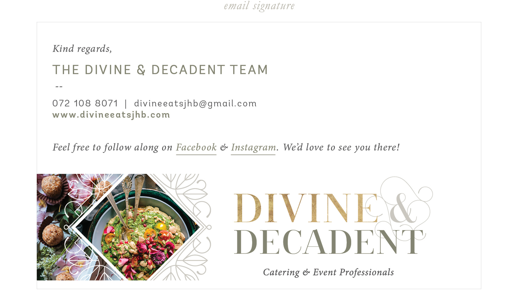 Absolutely loved working on the branding for Divine & Decadent, a vegetarian catering & events company with a focus on quality and a heart for people. To compliment their clear vision of creating an unforgettable experience, I wanted to create a brand that would be equally striking and memorable. We ended up with a corporate identity that is striking and sophisticated, with intricate details which allude to their Indian roots. It was very important to us that this brand would be on par with the highest industry standards while also appealing to a wide audience & I think we did just that. Feast your eyes!
